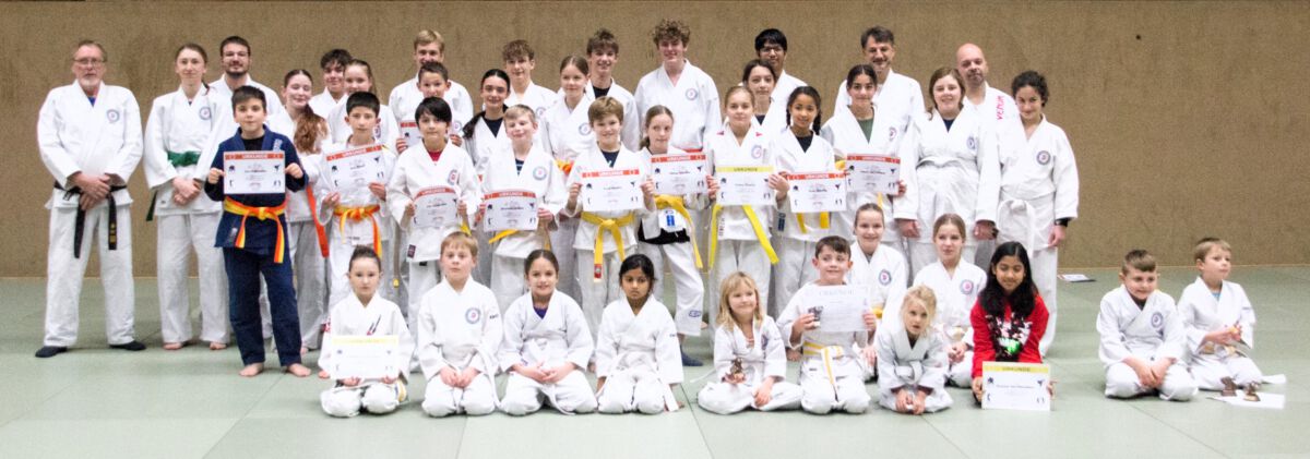 Am Samstag, den 13.12.2025 lud die Jiu-Jitsu-Abteilung zur großen Abteilungsweihnachtsfeier in die Bürgerhalle Jugenheim ein. Gemeinsam verbrachten die Kinder und Jugendlichen mit ihren (Groß-)Eltern, Geschwistern und den Jiu-Jitsuka der Erwachsenengruppe einen gemütlichen Nachmittag mit einer reichhaltigen Auswahl an Plätzchen, Kuchen und mehr. Zu den Highlights der Weihnachtsfeier gehörte die gemeinschaftliche Vorführung aller Jiu-Jitsuka, sodass die Entwicklung vom Anfänger bis zum fortgeschrittenen Niveau in der japanischen Kampfkunst sichtbar wurde. Zudem bekamen die Prüflinge der Kyu-Prüfung Ende November ihre neuen Gürtel verliehen. Im Rahmen der Weihnachtsfeier wurden schließlich auch die Ehrungen für die besonders regelmäßige Trainingsteilnahme im zurückliegenden Jahr vorgenommen.